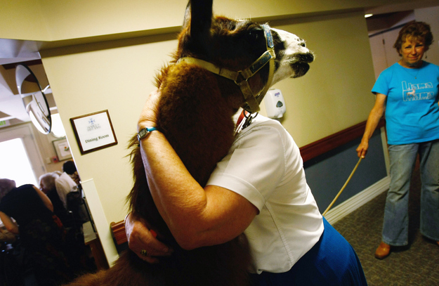 4. Výskum ukázal, že lamy sú jedným z najlepších terapeutických zvierat na svete. Na tejto foto dostáva Pisco pusu od sestričky v miestnej nemocnici, ktorú pravidelne navštevuje.