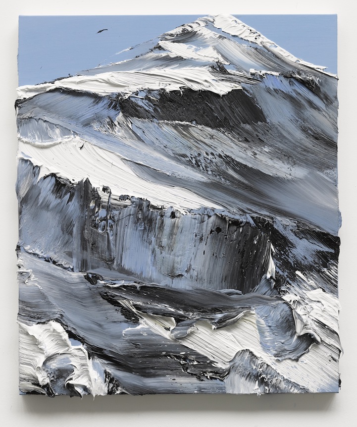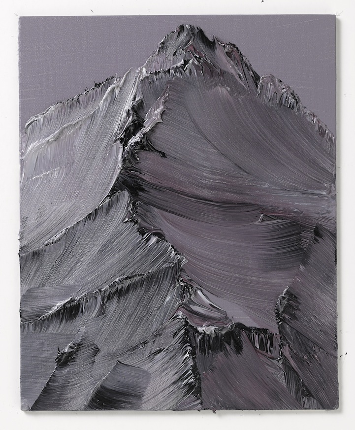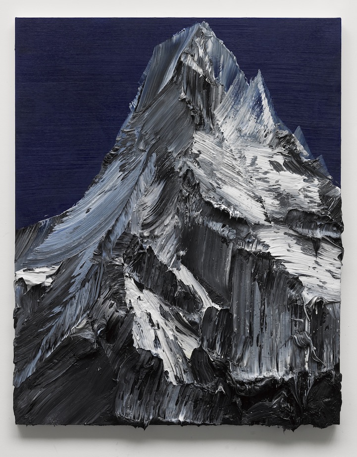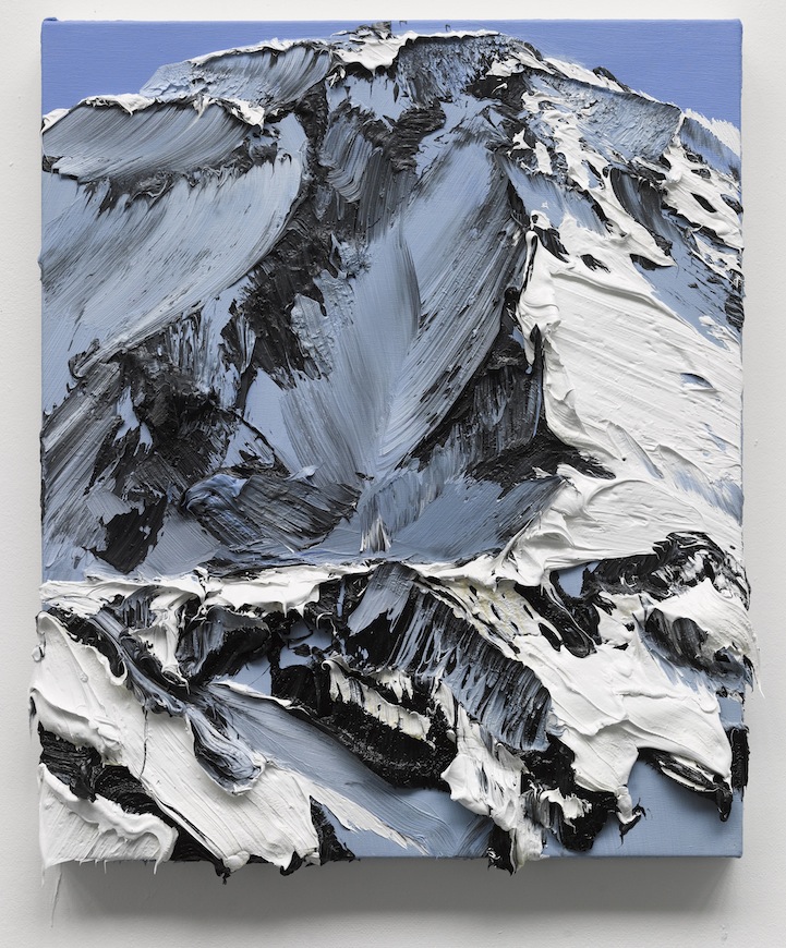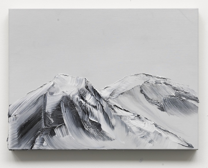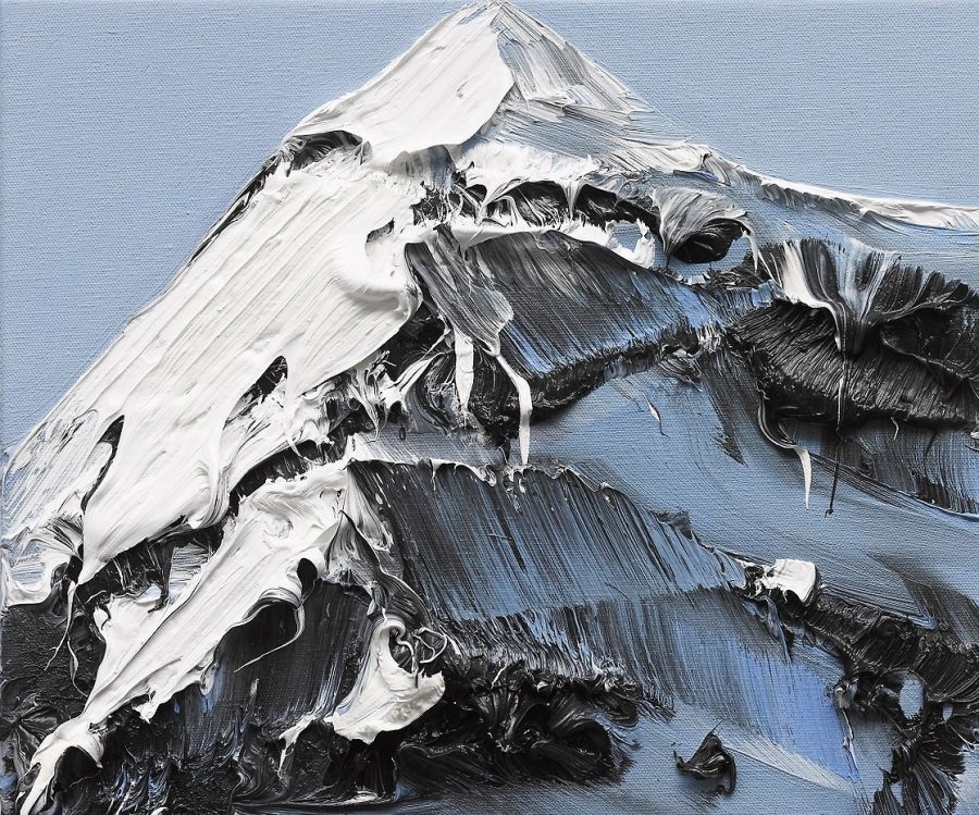 Takmer náhodný mix množstva modrej, bielej a čiernej farby stekajúcej z plátna vytvára ilúziu skutočných majestátnych hôr. Vizuálny trik umelec používa k vytvoreniu dokonalých obrazov, ktoré vás po jedinom žmurknutí oka zavedú priamo k mocným štítom švajčiarskych álp.