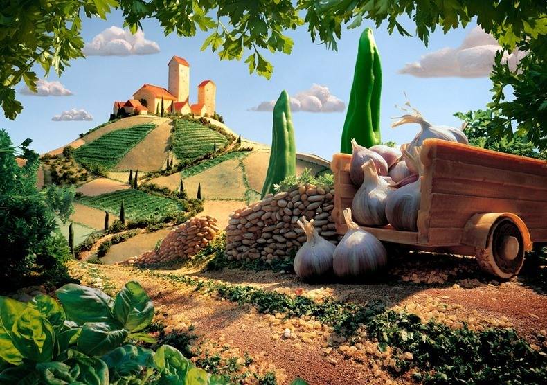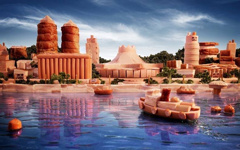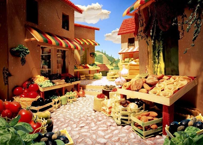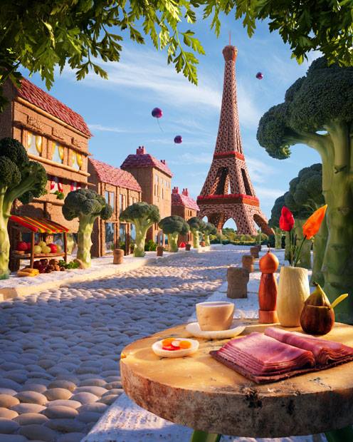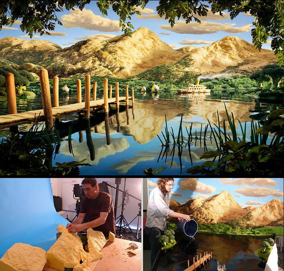 Carl vytvára tieto ohromujúce, realisticky vyzerajúce fotografie pomocou bežných potravín. Tak je možné namiesto kameňa postaviť veľký čínsky múr z ananásu, Atény z párkov, namiesto stromu použiť brokolicu alebo postaviť most z uhorky.