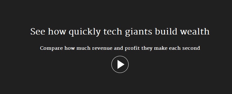 Za infografiku môžeme ďakovať marketingovej spoločnosti Distilled , ktorá projekt pripravila pre klienta WorldPay Zinc. Porovnáva revenue (príjmy) a profit (zisky) najväčších internetových a IT spoločností planéty, s časovaním na sekundy.