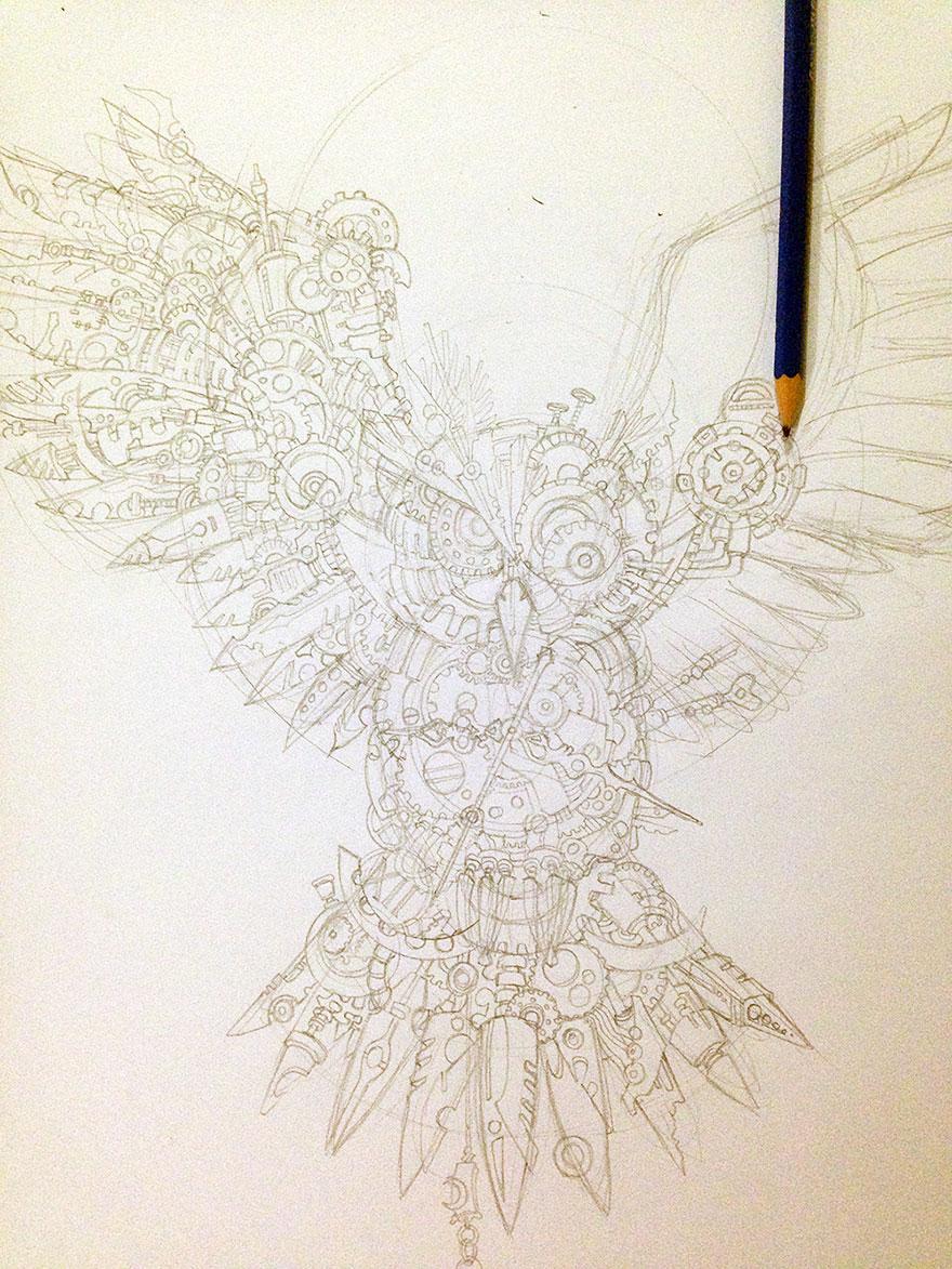 Jeho najnovšie dielo sa volá Strážca času. Tento úžasný portrét sovy nám ponúka nečakaný zvrat – sova je totiž zložená z malých ozubených kolies, čapov a iných mechanických kúskov, ktoré sú nakreslené naozaj do posledného detailu.