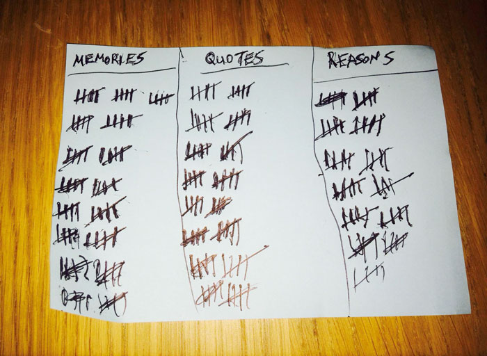 Na jedny papieriky vypísal spomienky, na ďalšie citáty o láske a na ďalšie zase dôvody, prečo svoju partnerku miluje. Frajerka si jeden lístoček otvorí každý deň.