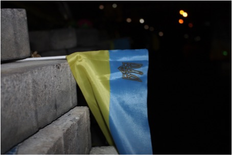 Vlajka Ukrajiny zapichnutá v jednom z pamätníkov, ktorými si Kyjevčania pripomínajú udalosti z Majdanu.