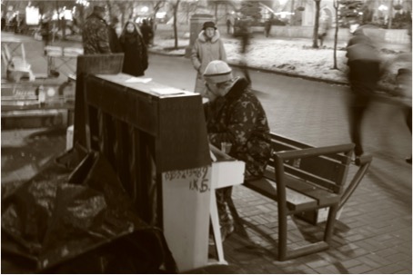 Pani hrá na klavíri v uliciach Kyjeva.