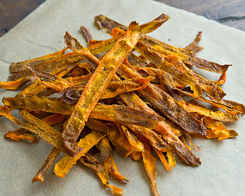 Kari mrkvové chipsy - kari je ideálnym korením ku tenučkým mrkvovým chipsom. Ich korenistú chuť si jednoducho zamilujete aj ak nie ste najväčším milovníkom mrkvy. Namiesto kari môžete použiť aj obyčajnú soľ, korenie, či iné koreniny. Stačí vám len väčšia mrkva, obyčajná škrabka, lyžička olivového oleja, ½ - 1 lyžička sladkého kari, soľ a korenie. Postriekajte plech olivovým olejom, škrabkou naškrábte tenké plátky jednotnej hrúbky, v miske zmiešajte s olivovým olejom a koreninami a vložte na 10-12 minút do predhriatej rúry na asi 180°C. Dávajte pozor, aby sa plátky neprekrývali. Chipsy vám pekne zhnednú a ostanú krásne chrumkavé. Zdravé a jednoduché občerstvenie je na svete.