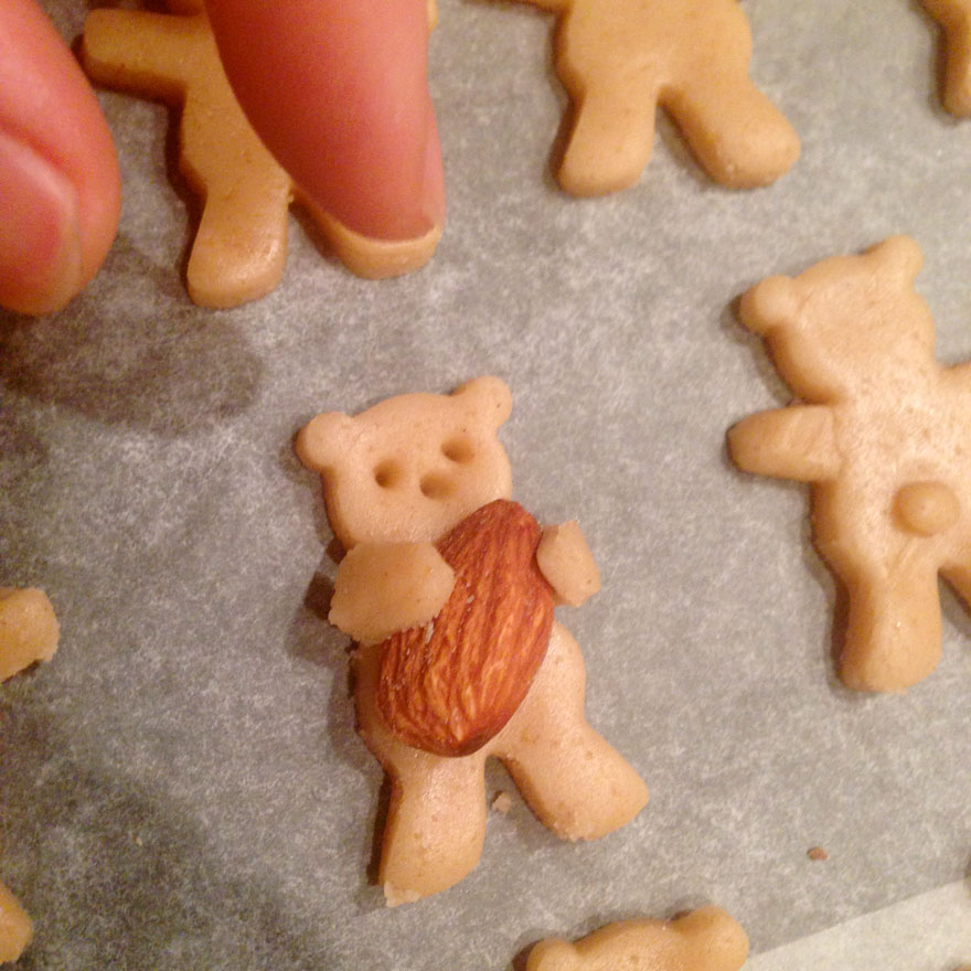 Recept - Rúru si predhrejte na 160°C. V jednej miske zmiešajte suché suroviny - 110g hladkej múky, 20g zemiakového škrobu a štipku soli a v druhej mokré - 40g cukrového sirupu, 10g medu a 30g rastlinného oleja. Dôkladne premiešajte, cesto vložte medzi dva papiere na pečenie a rozvaľkajte. Teraz už iba povykrajujte medvedíkov (prípadne iné zvieratká), nakreslite tváričku, do stredu umiestnite oriešok a potom ho už len objímte. Zo zvyškov cesta urobte medvedíkom chvostíky a vo vyhriatej rúre pečte 10 minút. Potom znížte teplotu na 150°C a pečte ďalších 10 minút. Vyberte z rúry a už si len pochutnávajte na roztomilých, no veľmi chutných sušienkach.