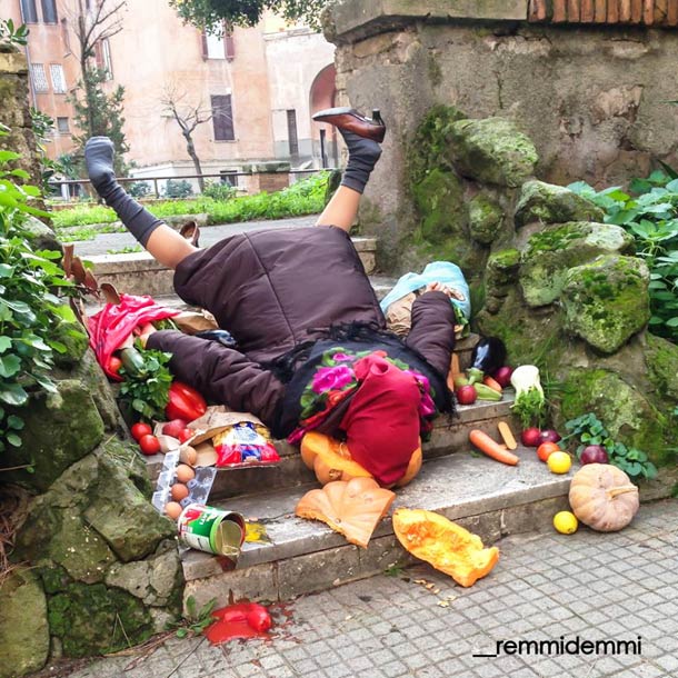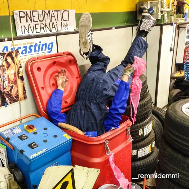 Jeho kolekcia je zábavná, ale aj znepokojujúca zároveň. Giordano sa zameriava na kultúru orientujúcu sa na spotrebné statky a ľudí, ktorí sú riskovať svoje vlastné zdravie a bezpečie, len aby zachránili svoj majetok. „Okamžite som pocítil potrebu zachytiť moment nárazu," vysvetľuje umelec. „Chcel som hovoriť o posadnutosti, neuróze, slabosti našej skazenej doby skrz moje osobné skúsenosti.“ Jeho kompletnú sériu bláznivých fotografií, ktoré zachytávajú skutočných hercov schopných mimoriadne ohýbať svoje telá do skrútených pozícií, si môžete tvárou v tvár, alebo aj tvárou v zem, pozrieť aj na Instagrame - remmidemmi.