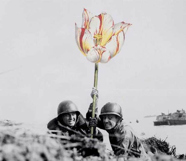 Francúzsky umelec prepísal dejiny. Na historických vojnových fotografiách dal vojakom do rúk namiesto zbraní obrovské kvetiny.