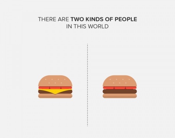 Veľmi trefne to vystihli výtvarníci na Zomato, ktorí ukázali, že v skutočnosti sú na svete len dva typy ľudí. Buď chováte doma mačku, alebo psa. Buď pijete kávu, alebo čaj. Vo fastfoode si dáte hamburger, alebo cheeseburger. Vidíte aké je to jednoduché? Tak aký typ človeka ste vy?